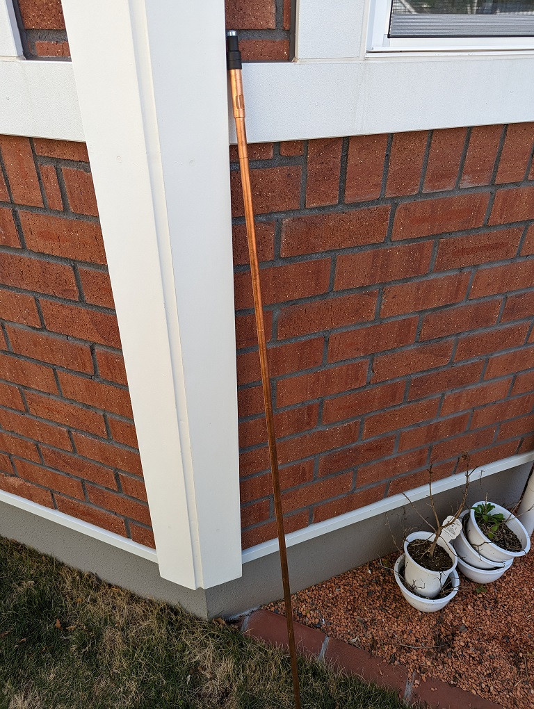 I'm trying to set up an RF/lightning ground for my 2nd floor shack in a country that doesn't use US style grounds in its electrical system. The shack is in the right-rear corner of my house and the water and electrical service entrances are in the left-front corner. A utility pole just off the street supplies power via overhead wires. The house ground, if it exists at all, would be near the utility pole and could not be further away from my shack. It is therefore not possible for me to run a wire from it to below my shack window. The house's circuit panel is located near the entrance on the first floor - no chance of reaching it either. As is typical in earthquake-prone Japan, there is no basement, just a short crawlspace above a concrete slab. You'd have to be a mole to crawl around down there and I'm too old for that kind of activity.