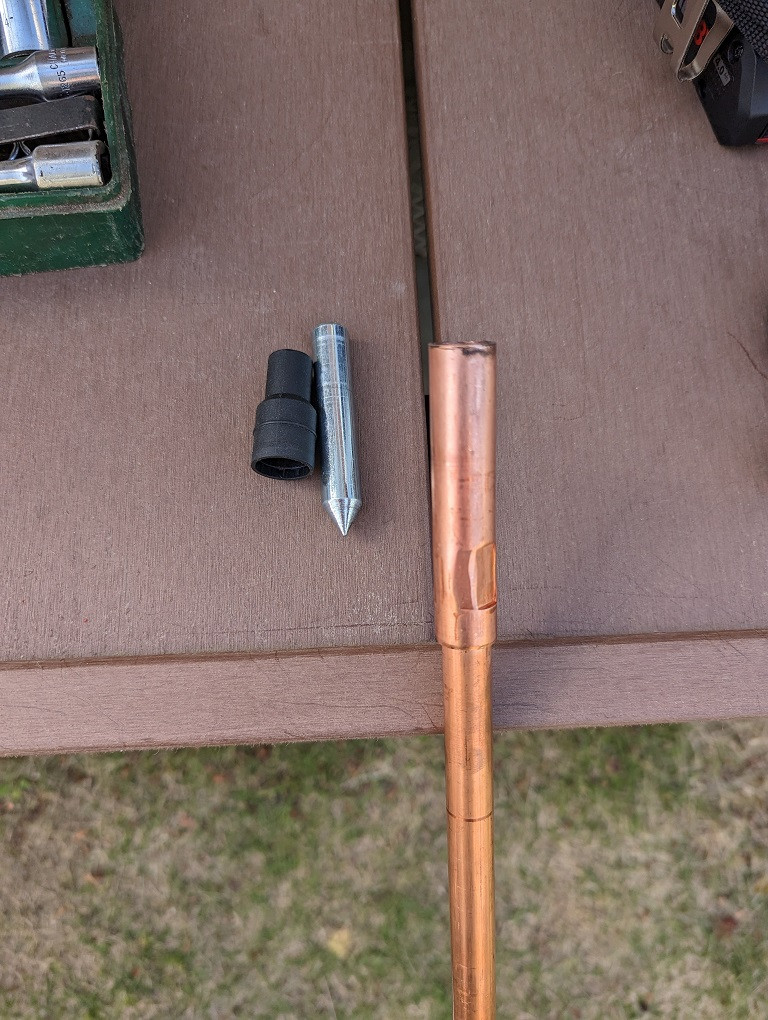 My immediate concern, however, is how to bury that 5 foot rod. I've tried pounding the end with a big claw hammer, and then using a Bosch impact driver, but neither would budge it. The ground is rocky clay reclaimed from other building sites. I know it can be penetrated but I apparently don't have the tools and/or strength to do it. So how is this seemingly simple task done?